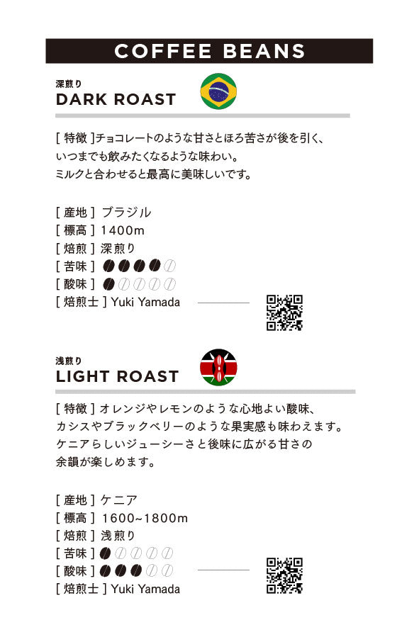 オレンジやレモンのような心地よい酸味に加え、カシスやブラックベリーのような果実味も味わえます。ケニアらしいジューシーさと、後味に広がる甘さの余韻が楽しめます。